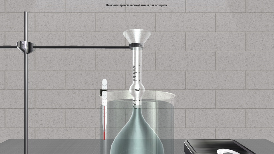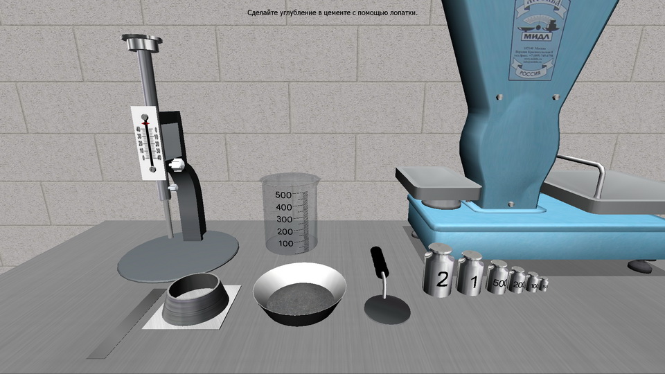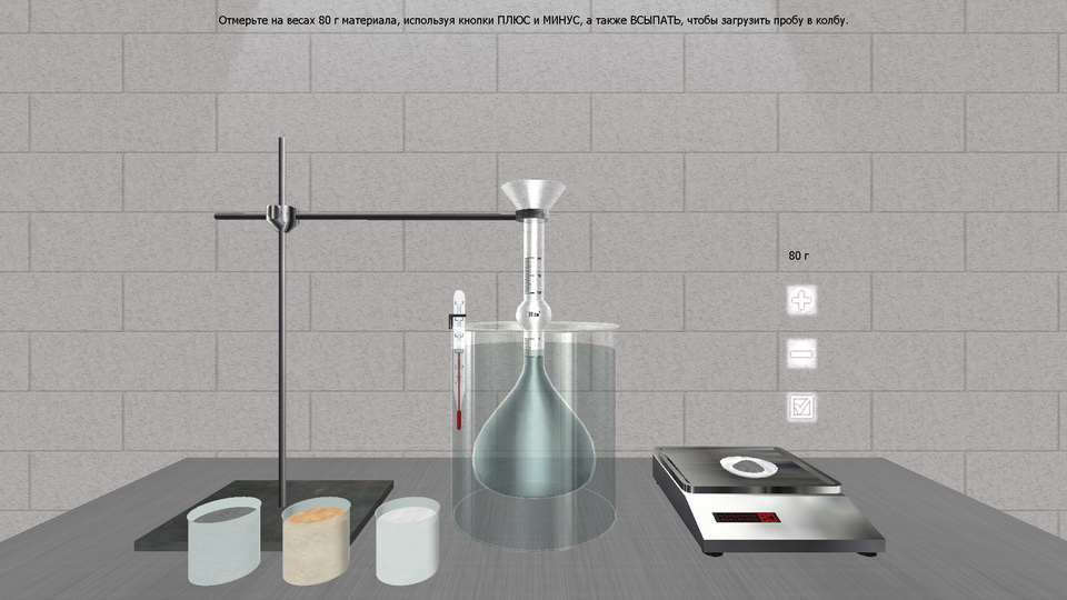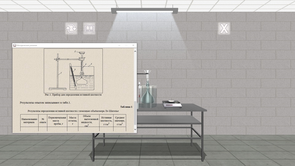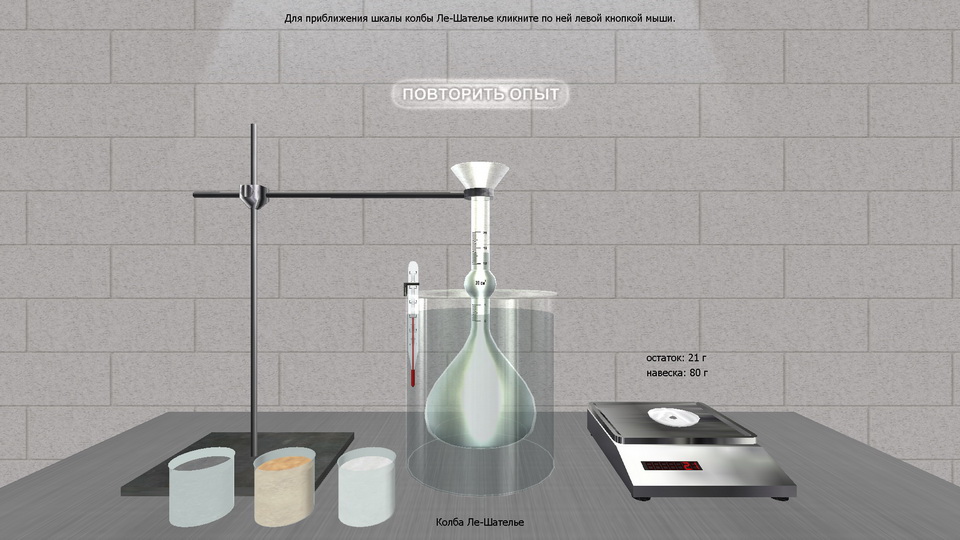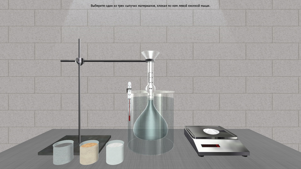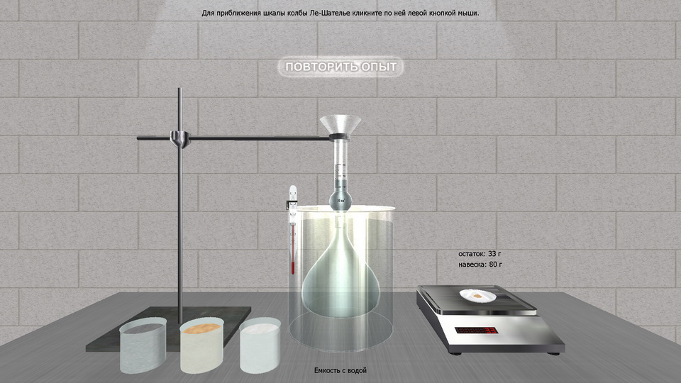 OBJECTIVE: The determination of the true density of the powder material using a special glass flask – Le Chatelier volume meter. SUMMARY: The main element of the laboratory setup is the standard Le Chatelier volume gauge. In the flask of the volume meter, there is an inert liquid in which a sample of the powdered material is placing. The volume of fluid displaced from the flask is measured. The input parameters of the simulation experience are: the type of building material (cement, sand, gypsum) and the mass of the experimental sample. The output data are: the mass of the sample residue and the volume of the displaced fluid.