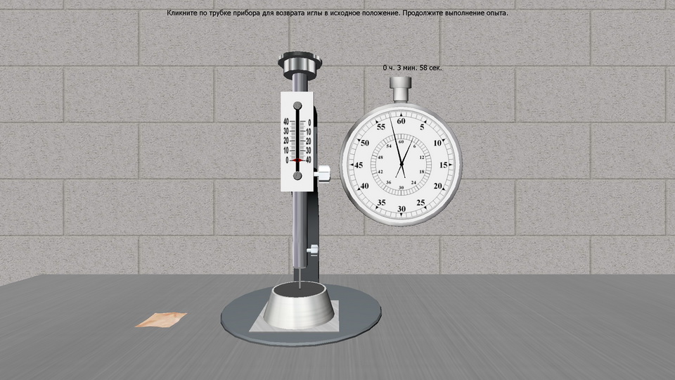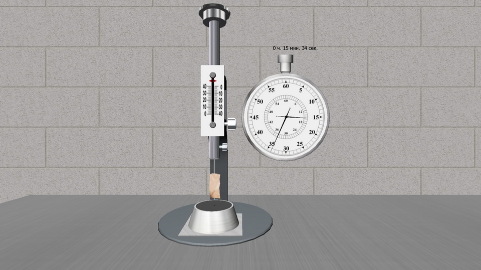 OBJECTIVE: The determination the setting time of cement paste using the Vicat device. SUMMARY: The test is carried out using a standard Vicat device, equipped with a thin metal needle. During the test, a ring-shape with cement paste is installed on the Vicat device platform, after which the needle is immersed in the cement paste with a certain time step. At each immersion, the depth of the lowering of the needle into the cement paste is measured. The input parameter of the simulation experience is the time of measure the depth of immersion of the needle of the Vicat device into the cement paste. The output parameter of the experiment is the depth of immersion of the needle of the Vicat device into the cement paste. According to the test results, the time of the beginning and end of the cement setting is recorded.