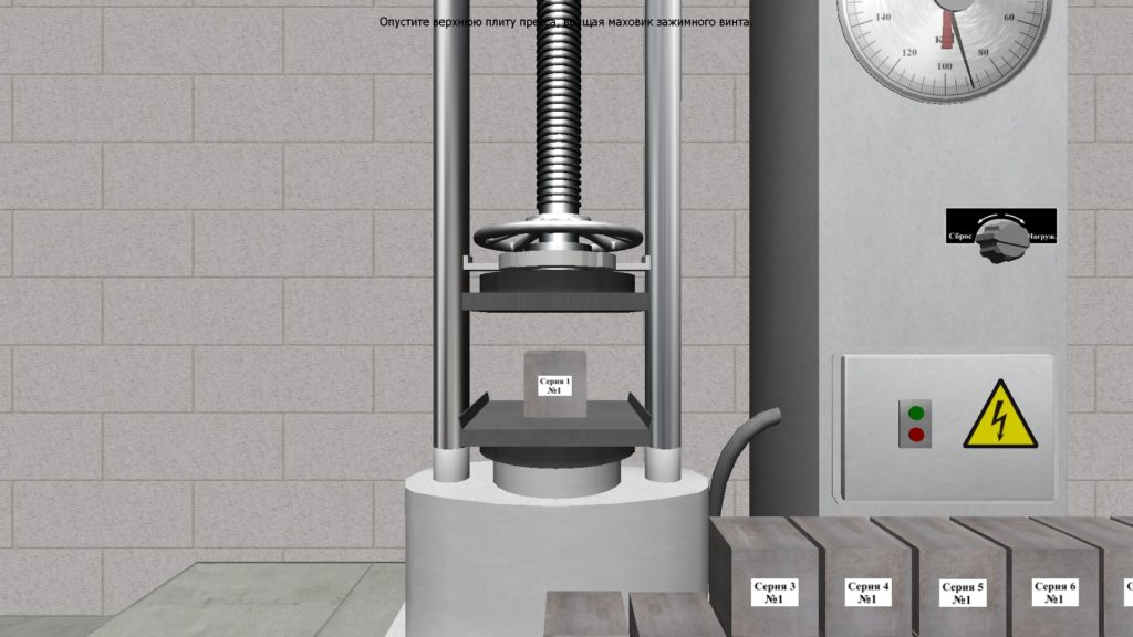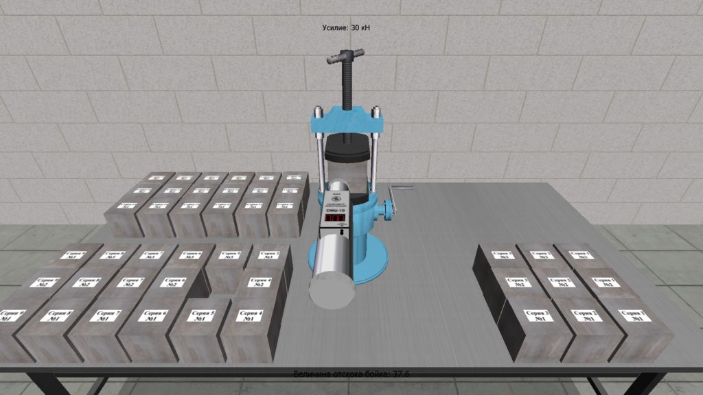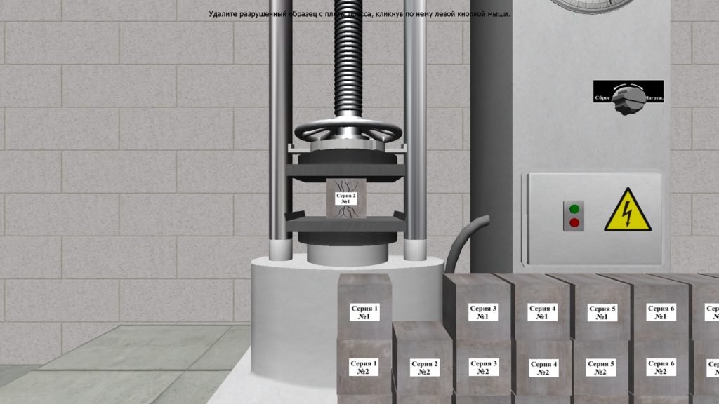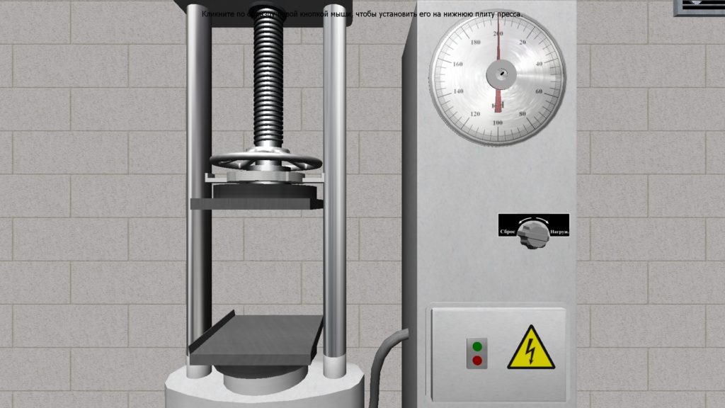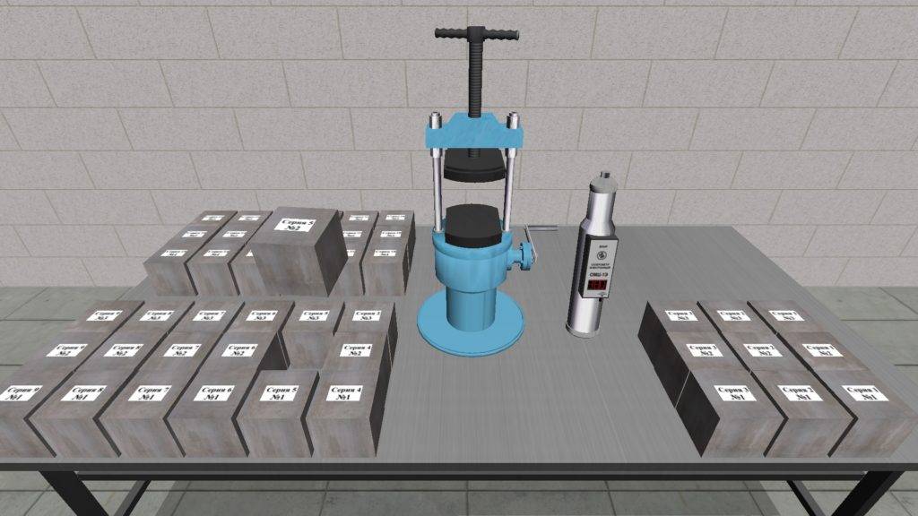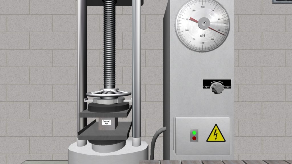 OBJECTIVE: The determination the compressive strength of concrete using a laboratory hydraulic press. SUMMARY: The laboratory stand is represented by a hydraulic press with a maximum load of 200 kN. In the process of performing the work, standard samples of concrete of cubic form are tested. The input parameter of the simulation experience is the number of the selected test sample-cube of concrete. The output parameter is the value of the effort of destruction of the sample under the loading plate of the hydraulic press in kN.
