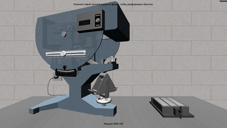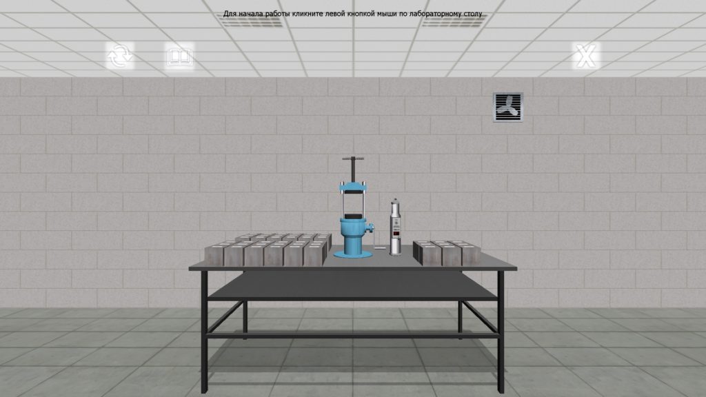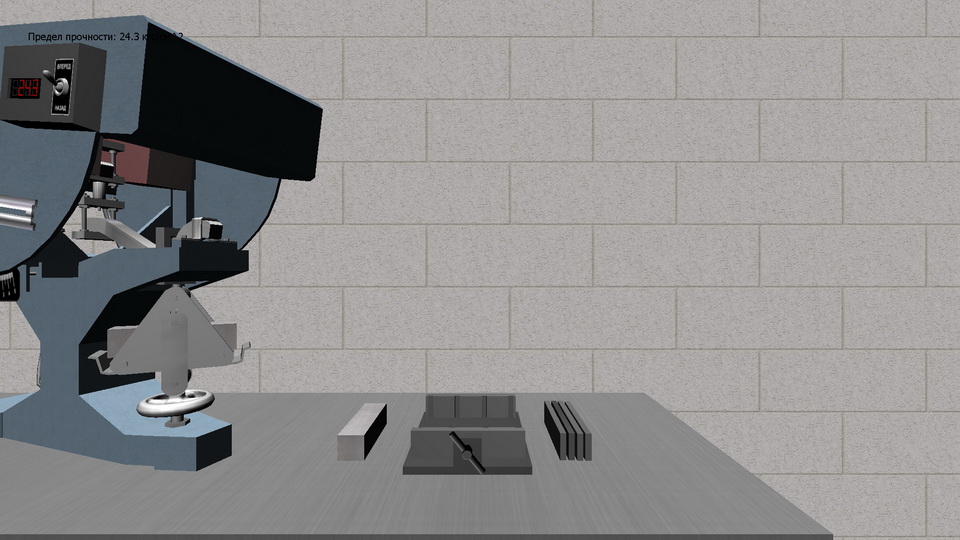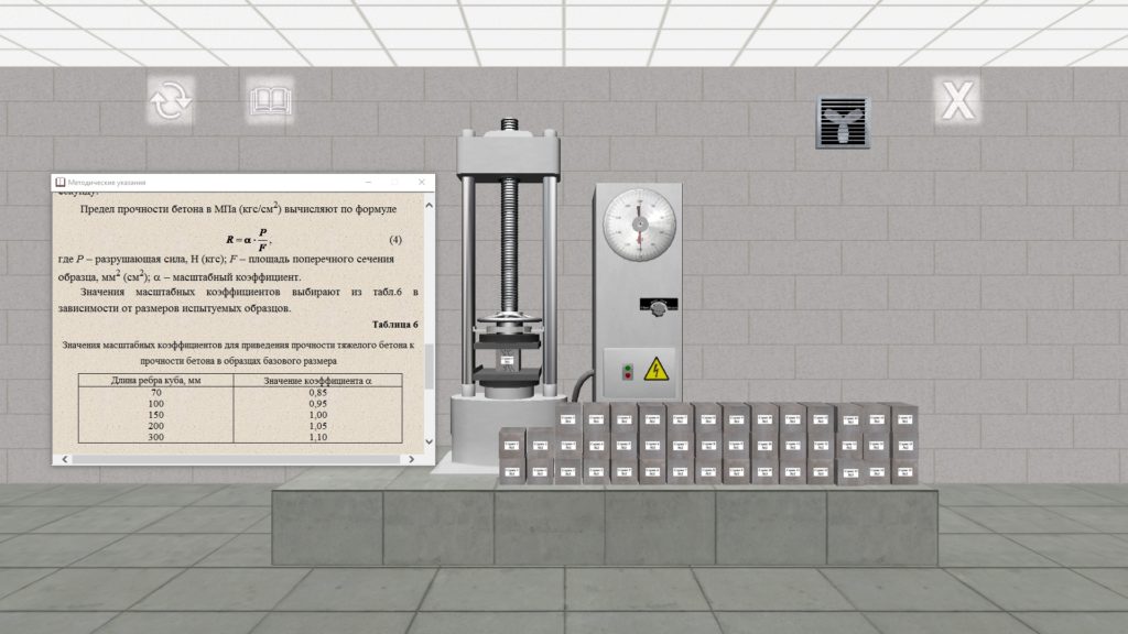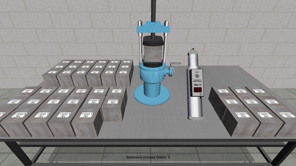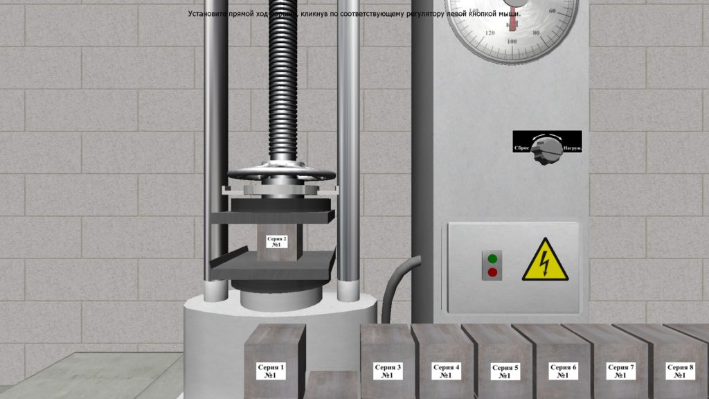 OBJECTIVE: The determination the compressive strength of concrete using a laboratory hydraulic press. SUMMARY: The laboratory stand is represented by a hydraulic press with a maximum load of 200 kN. In the process of performing the work, standard samples of concrete of cubic form are tested. The input parameter of the simulation experience is the number of the selected test sample-cube of concrete. The output parameter is the value of the effort of destruction of the sample under the loading plate of the hydraulic press in kN.