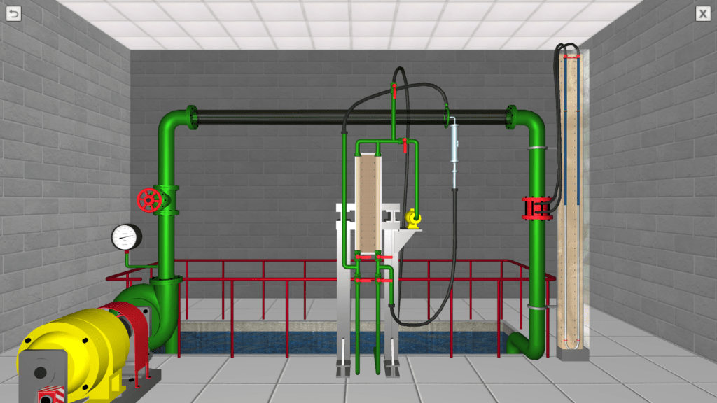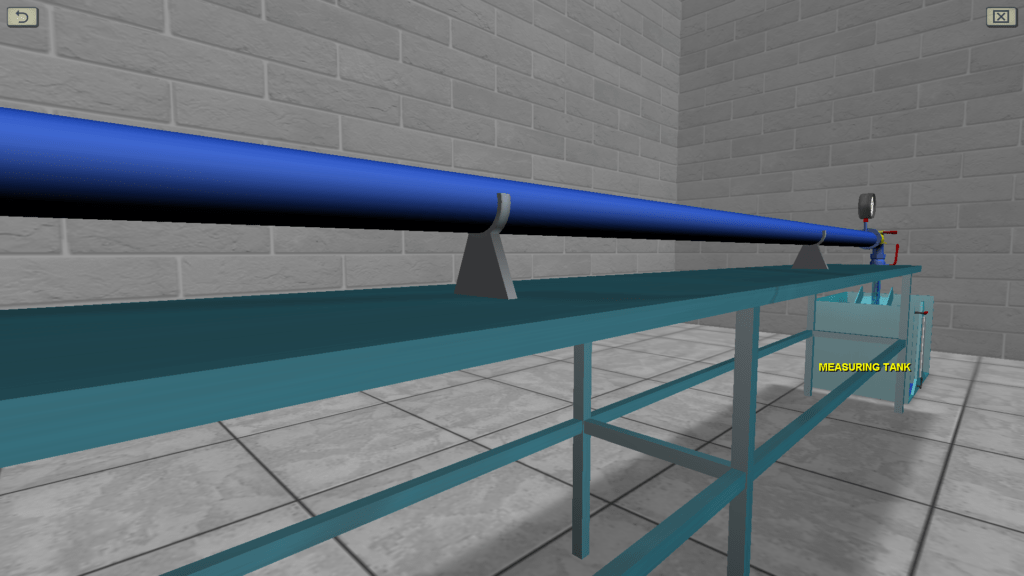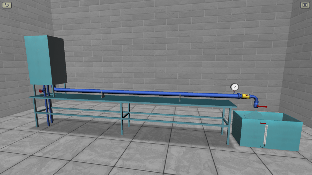 OBJECTIVE: The experimentally confirmation the existence of laminar and turbulent flow of fluid by observing the process of staining a stream of water in a glass tube; the calculation according to the experiments of the Reynolds number values in the laminar and turbulent regimes, comparing them with the critical one; the plotting, according to the experimental data, a graph of the pressure loss along the length of the mean flow velocity, determining with its help the critical velocity and the critical Reynolds number; the confirmation (using the plotted graph) of the proportionality of head loss along the length of the average flow velocity to the first degree in the laminar mode, and in the case of turbulence – to the extent of 1.75≤m≤2. SUMMARY: The laboratory stand consists of a pressure tank, a horizontal glass tube, two measuring piezometers and a flow meter tank. A trickle of colored liquid is fed into the glass tube, allowing you to visually observe the flow pattern. To change the water flow in the system, there is a control valve installed at the end of the pipeline. Water flow in the system is measured using a stopwatch.