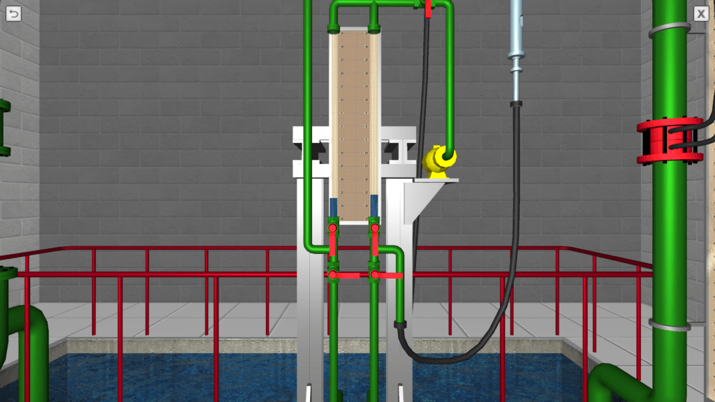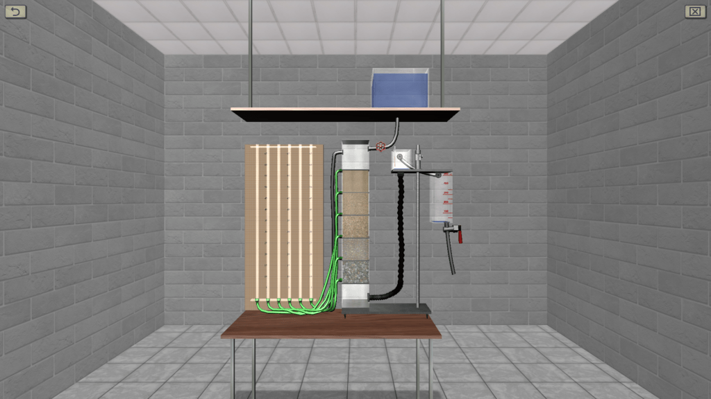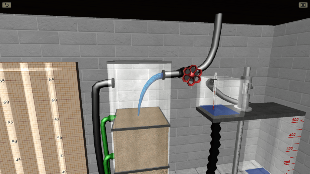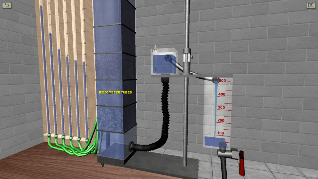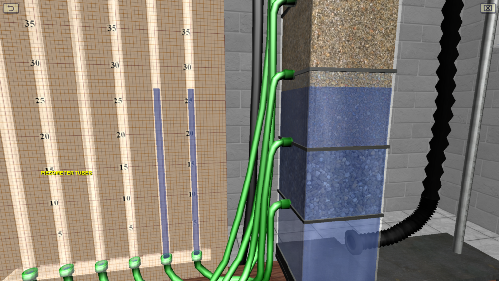 OBJECTIVE: The confirmation the validity of the Darcy law by constructing to scale graphs of the filtration rate versus pressure gradient (graphs for five types of sandy soil, differing in particle size); the determination of the average value of the filtration coefficient for one type of sandy soil according to the plot, with its indication on the graph; the plotting (on a scale) according to a single experiment a pressure profile (head pressure variation along the filtration path). SUMMARY: The laboratory stand is represented by a vertical glass column having several sections with soil of various grain sizes. The water is fed from the top down into the column. At each level of the column, a measuring piezometer is connected using a flexible hose. Water pressure is regulated using a special overflow device. Water flow in the system is measured using a stopwatch.