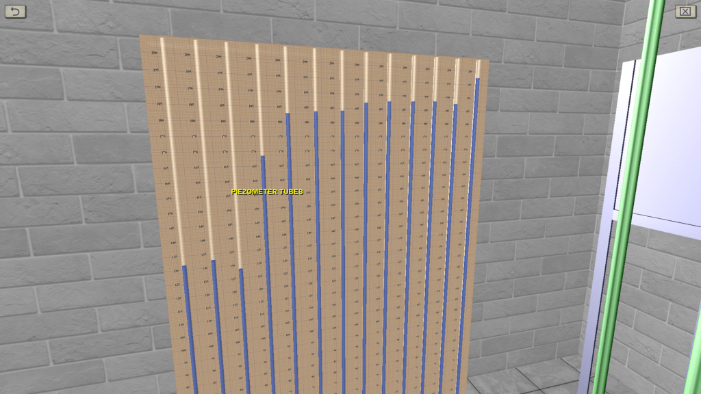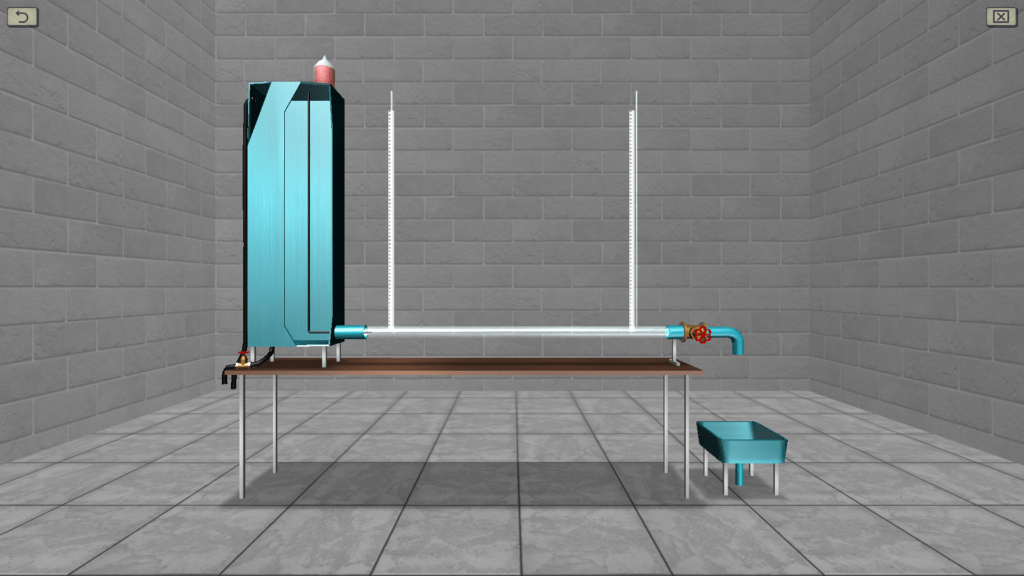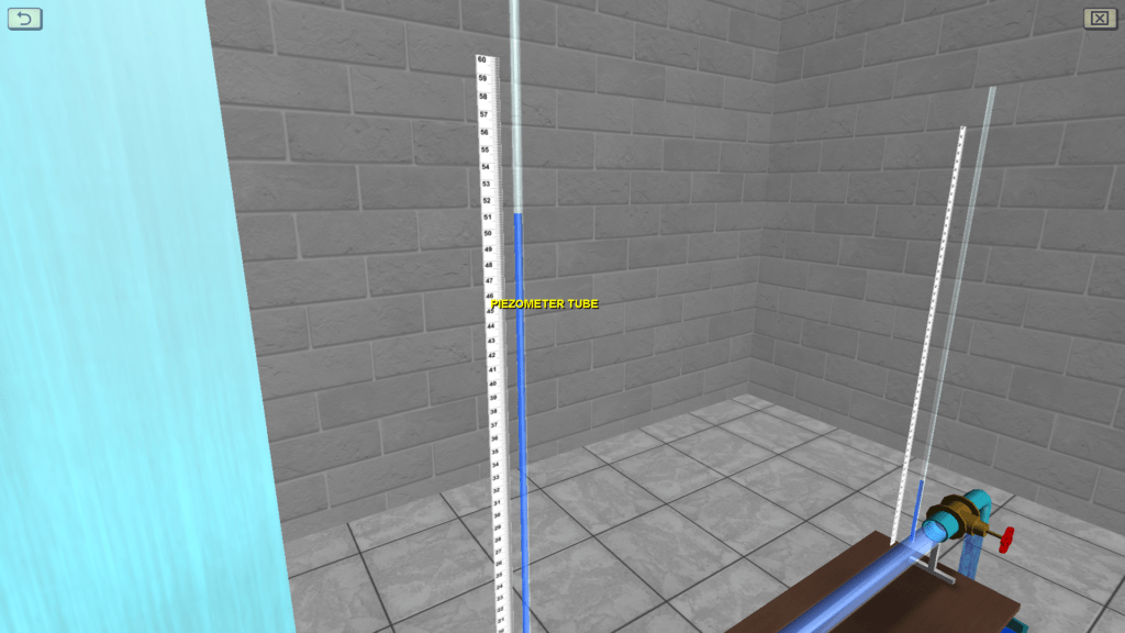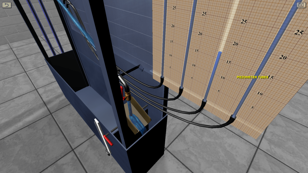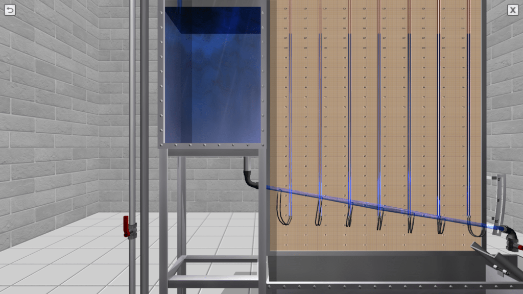 OBJECTIVE: The observation the transition of specific energy in a fluid flow from potential to kinetic energy and back in accordance with D. Bernoulli’s equation on a discharge pipe of variable cross section using piezometers, as well as construction a piezometric and pressure line for the water flow by experimental data. SUMMARY: The hydraulic system includes a pressure tank, a glass tube of variable cross section (expanding/tapering in the middle), a system of measuring piezometers and a flow meter tank. The angle of the glass tube is adjustable during operation. Water flow in the system is measured using a stopwatch.