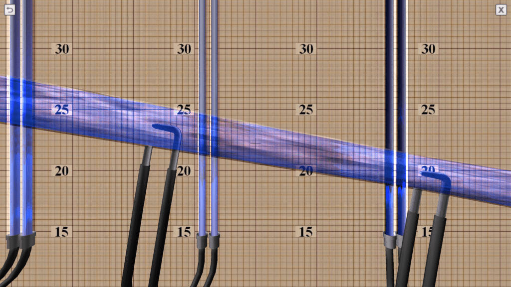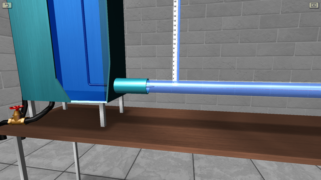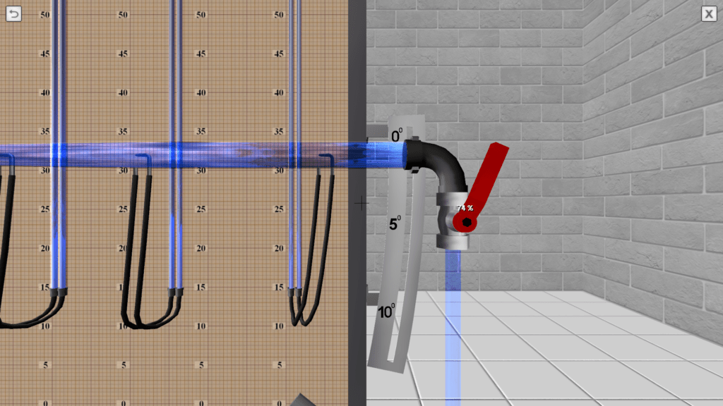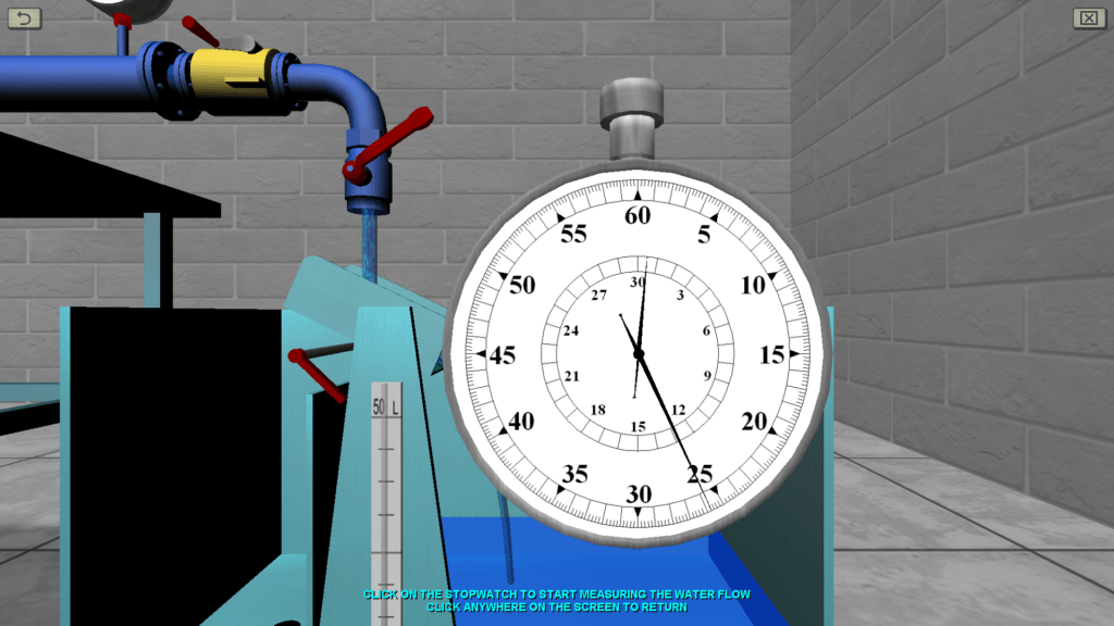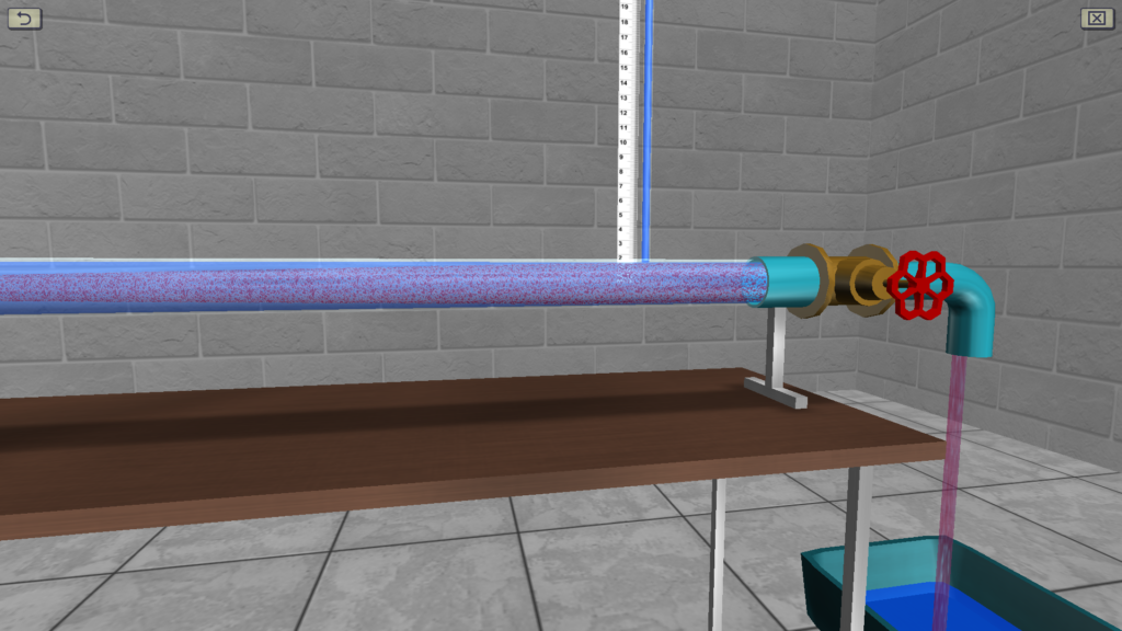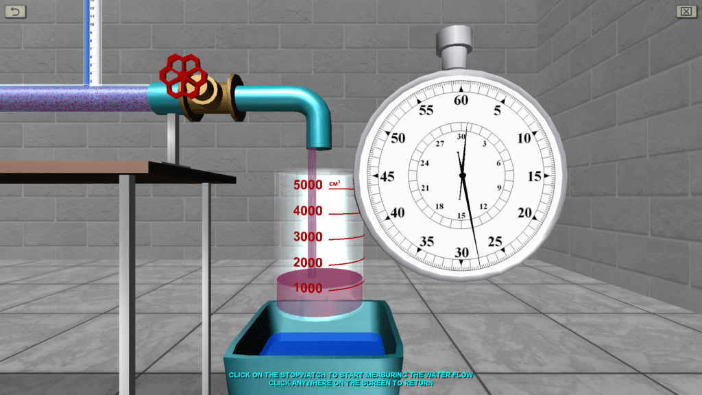 OBJECTIVE: The observation the transition of specific energy in a fluid flow from potential to kinetic energy and back in accordance with D. Bernoulli’s equation on a discharge pipe of variable cross section using piezometers, as well as construction a piezometric and pressure line for the water flow by experimental data. SUMMARY: The hydraulic system includes a pressure tank, a glass tube of variable cross section (expanding/tapering in the middle), a system of measuring piezometers and a flow meter tank. The angle of the glass tube is adjustable during operation. Water flow in the system is measured using a stopwatch.