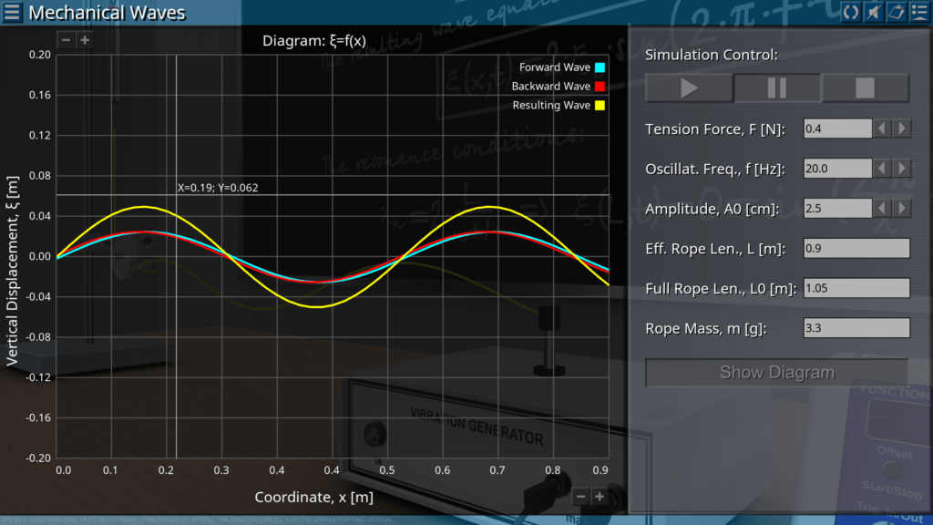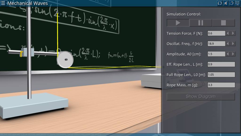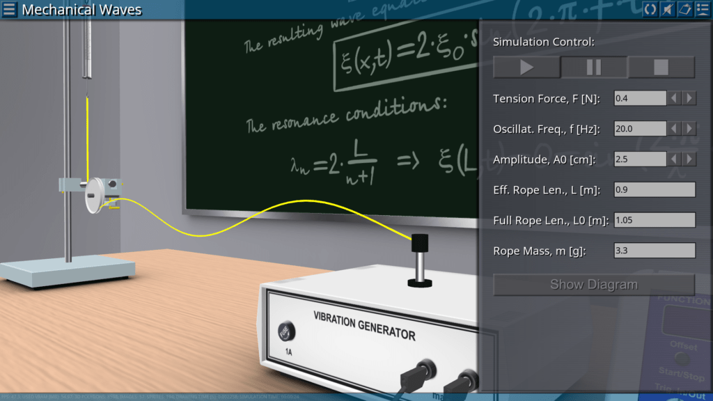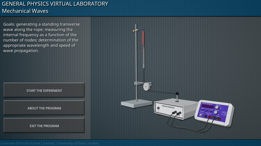 Goals: generating a standing transverse wave along the rope; measuring the internal frequency as a function of the number of nodes; determination of the appropriate wavelength and speed of wave propagation.