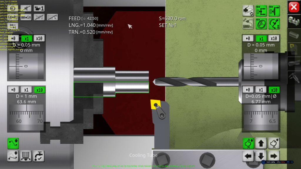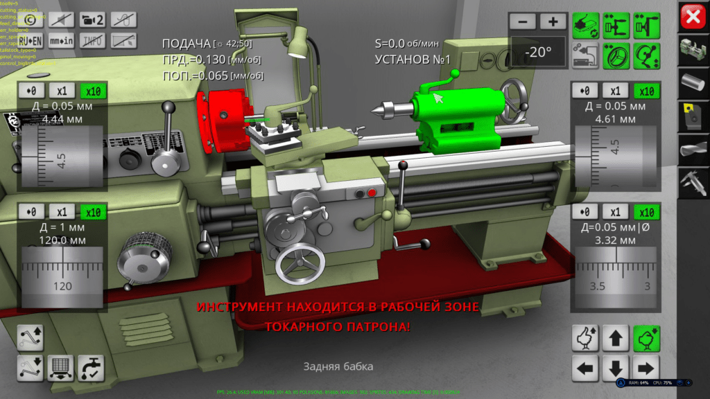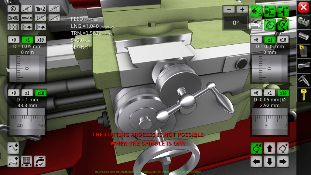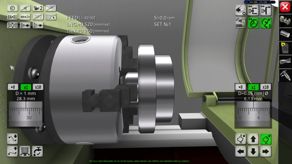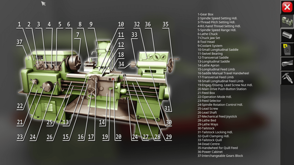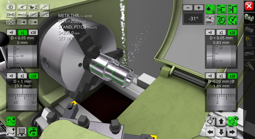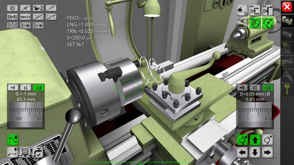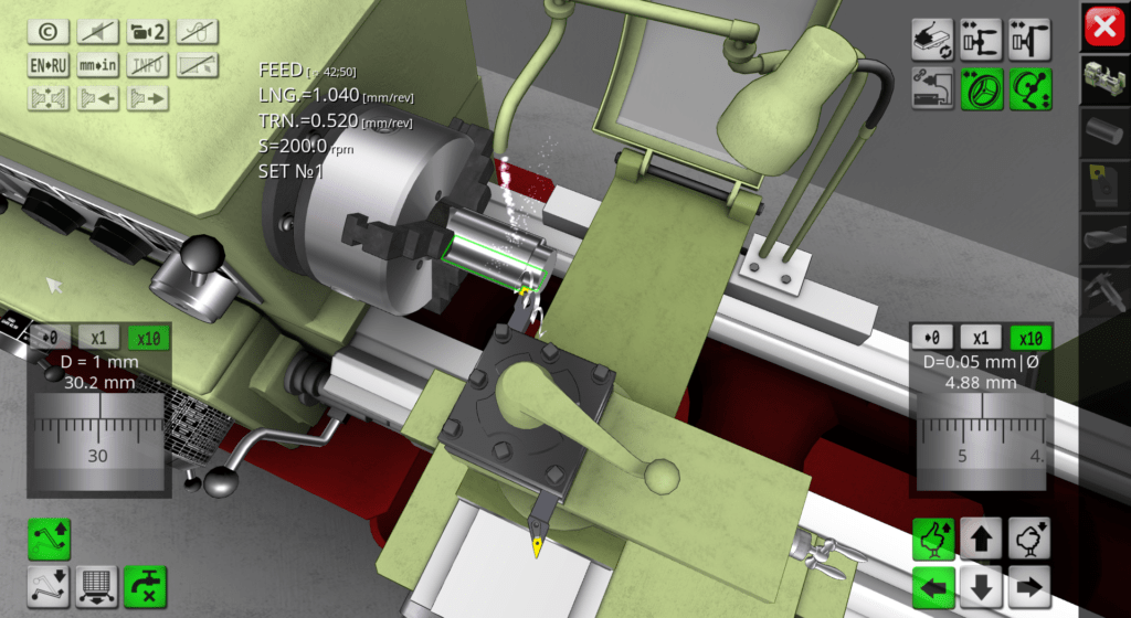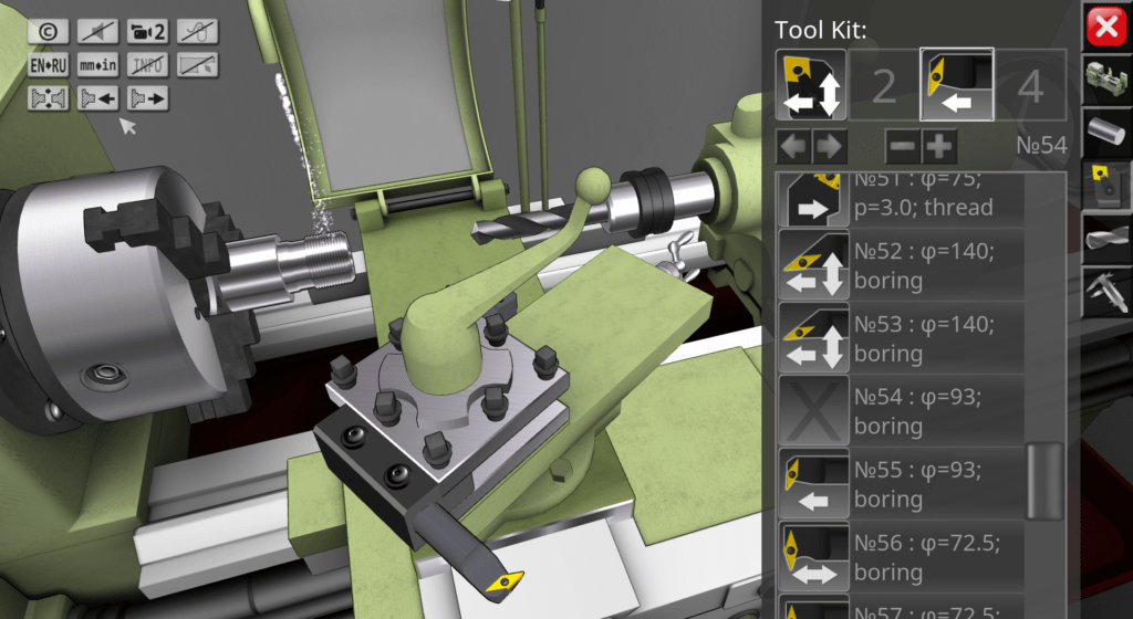3D simulator of a classic screw-cutting lathe machine mod. 1K62. The application simulates the performance of ordinary turning operations in an interactive mode. The capabilities of the simulation model include operations of external and facing turning, drilling and boring of holes, turning of grooves, cutting of external and internal threads. In the full version of the application, more than 70 cutting tools are available for work.